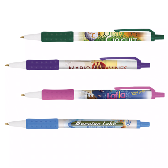 The most popular retractable in promotional products with full-color, full-barrel artwork capabilities and a soft, dimpled rubber grip.
