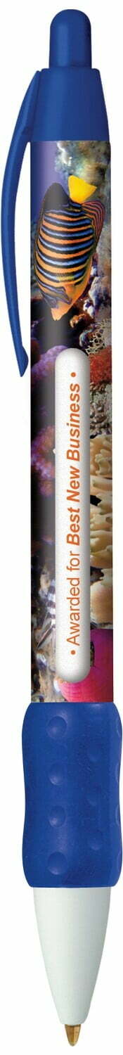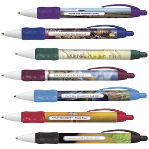 Bic Digital Message Pen BIC Digital WideBody Message Pen. LOW Minimums. NO Set-up Charges. 5-Working-Day Service. Create your own design. Full Color Graphics. High Definition 4-Color Process. 360 degree and Full Length of the Barrel. Affordable Small Order Quantities. Quantity: Minimum 300 pieces. For orders above catalog quantities, please contact your distributor for production time. Point Styles/Ink Colors: Medium Point: Black, Blue or Red Ink. Fine Point: Black or Blue Ink. Trim/Grip Color: Choose 1 trim/grip color: Black, Purple, Red, Blue, Navy, Burgundy, Forest Green. Message Tube Imprint: 1 1/2" x 3/32". 6 lines of 1-color copy. Approximately 40 characters per line, the less characters, the larger the imprint. Rotating Tube Imprint Colors Specify: 1.) Black. 2.) Match trim. 3.) Stock colors click here. Packaging: Standard - 14 lbs. (approx.) @ 500 per carton. Shipping: 2-day service at ground rates.