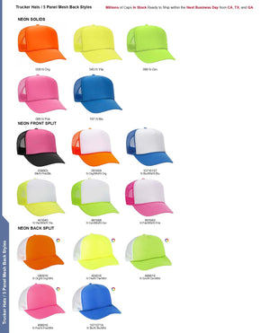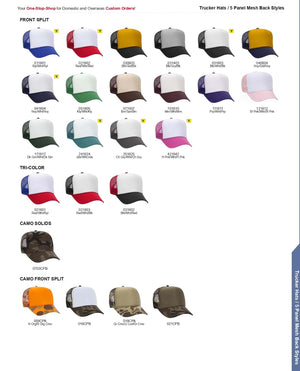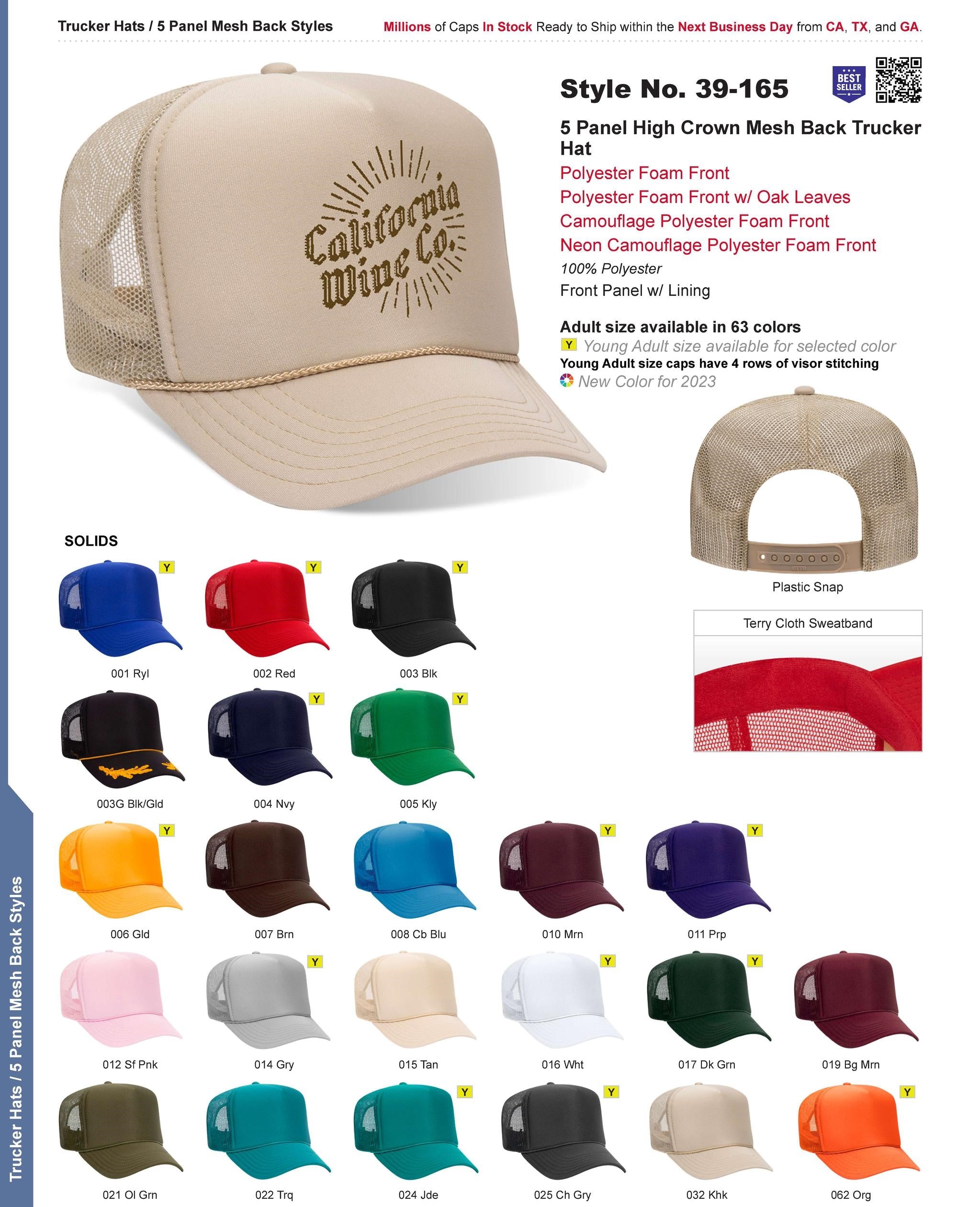 100% Polyester Front 100% Polyester Mesh Back The Traditional Look 5-panel cap Seamless Foam Front Panel with Lining Matching Color Braid 8 Rows Stitching on Visor Matching Fabric Undervisor Matching Color Sweatband Plastic Adjustable Snap OSFM - Adult (6 1/2 - 7 5/8)