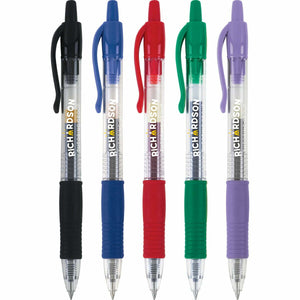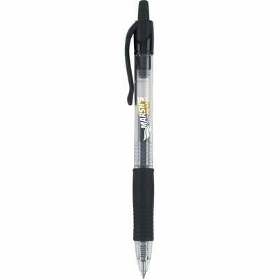 The G-2's retractable gel writing sensation will have your ad-message stand out over your competition. Features a contoured rubber grip and Pilot's revolutionary gel ink. The gel ink formula is water resistant and smear proof that will assure smooth skip free writing every time. Standard colors have a fine point refill with ink color matching the grip color. Metallic colors have a broad point refill, that sparkle with the ink color matching the grip color. Metallic inks are recommended for use on dark color paper. Standard color ink pens have a Smoke translucent barrel and the Metallic ink pens have a Clear translucent barrel. Product Colors: Black, Blue, Green, Purple,Red,Lime, Pink, Teal, Navy, Caramel, Forest Green, Orange, Process Blue, Burgandy and Dark Purple. PEN WRITES IN THE COLOR OF THE PEN