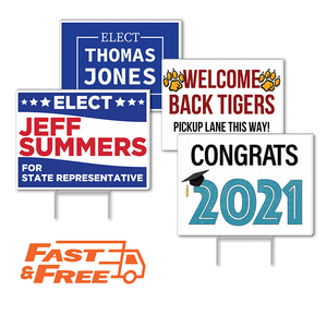 Get these custom printed yard signs with your own personalized message screen printed on side. For an extra .70 we can ship on the other of the sign.